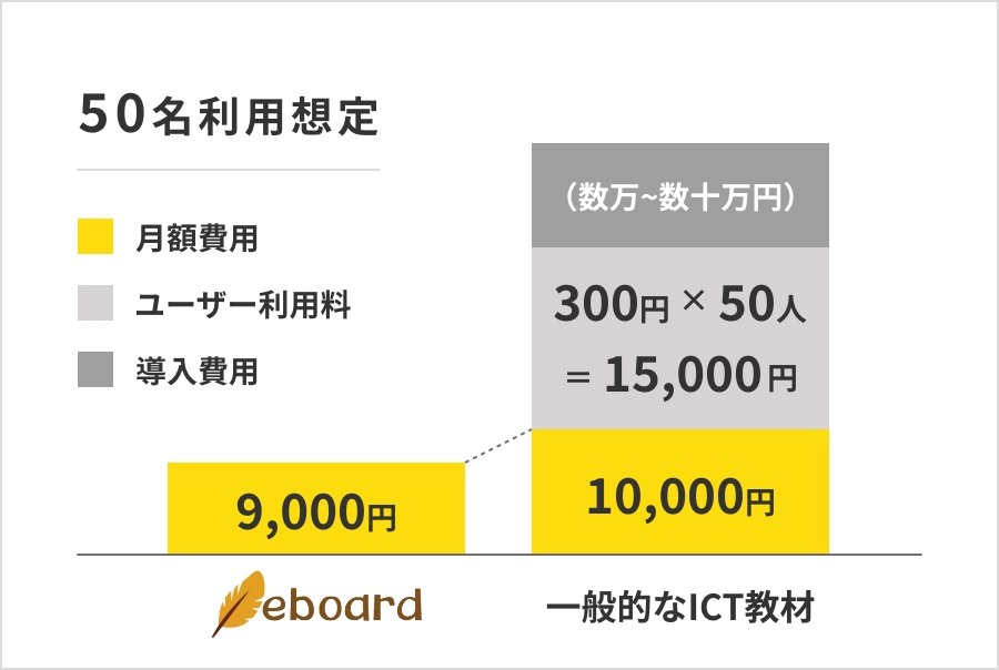一般的な教材では、月額費用に加え、ユーザー1人あたりの利用料や導入費用がかかる場合があります。それに対して、eboardでは月額利用料のみで追加の費用をかけずご利用いただけます。